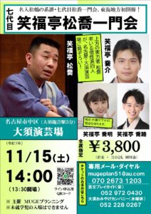 開催期間 2025年11月15日 2:00 PM - 4:20 PM Add To Calendar Download ICS Google Calendar iCalendar Office 365 Outlook Live予約 ¥3,800 今すぐ予約 開催場所 大須演芸場 中区大須2丁目19-39, 名古屋市, 愛知県, 460-0011 上方の本格派、笑福亭松喬師匠。「泥棒松喬」の異名通り盗人の噺が得意の松喬師匠の一門会が大須演芸場で開かれます。弟子の喬介、喬路、孫弟子の喬明の参加予定です。 (喬明は今休養中ですが、復帰したら出演します。) 予約 Do you already have an account with us? サインインアカウントをすでにお持ちの方は、ログインしてください。 ユーザー名 パスワード 上に表示された文字を入力してください。 ログイン キャンセル ログイン状態を保存する パスワードをお忘れですか ? チケット金額¥3,800 席数 12345678 ご登録情報 Do you already have an account with us? サインイン 名前 電話 メールアドレス コメント 私は、上に入力したデータが ウェブサイトによって収集・保存されることに同意します。 Booking Summary 1 x 七代目 松喬 一門会 ¥3,800 合計金額 ¥3,800